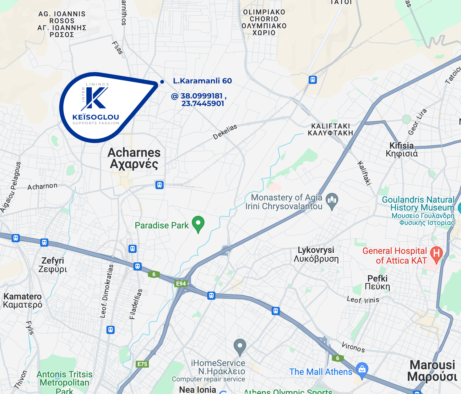 Lininings & InterliningsΕπικοινωνία Lininings & InterliningsΕπικοινωνία+30 210 33 13 140info @ keisoglou.gr+30 210 32 18 469Λεωφόρος Καραμανλή 60Αχαρνές 13671 Αττική@ 38.0999181 , 23.7445901Οδηγίες ΠρόσβασηςFacebookInstagram Έχουμε δημιουργήσει νέους λογαριασμούς στα social media FacebookInstagram Έχουμε δημιουργήσει νέους λογαριασμούς στα social media